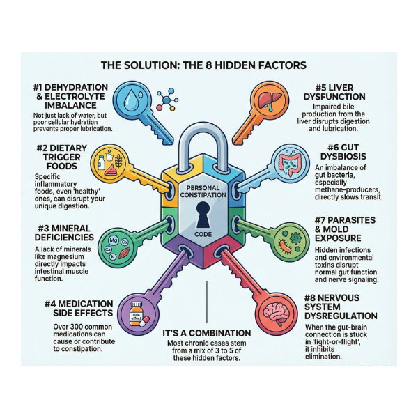 Your constipation isn't caused by just one thing—it's like a combination lock that requires at least three numbers to align before it opens. Most people have 2-4 of the 8 hidden root factors driving their constipation, which is why fixing just one issue never works. You might address your hydration, but if you also have gut dysbiosis and nervous system dysregulation, you've only turned one dial on a three-number lock. The Constipation Code helps you uncover YOUR specific combination so you can systematically address each hidden factor and finally unlock your body's ability to eliminate comfortably and consistently.